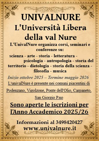 Organizzata dall’Associazione “Università della Terza Età Valnure” in collaborazione con le Amministrazioni Comunali di Podenzano, Vigolzone, Ponte dell’Olio, Carpaneto P.no e San Giorgio P.no